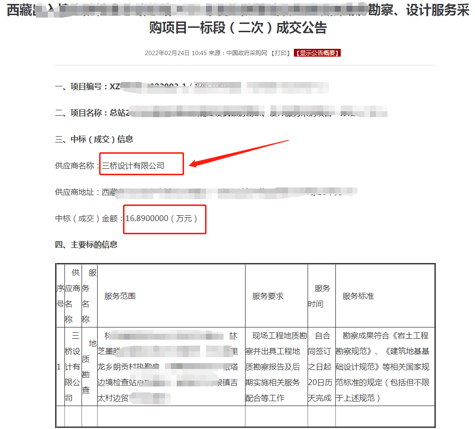三桥勘察项目中标16.89万!