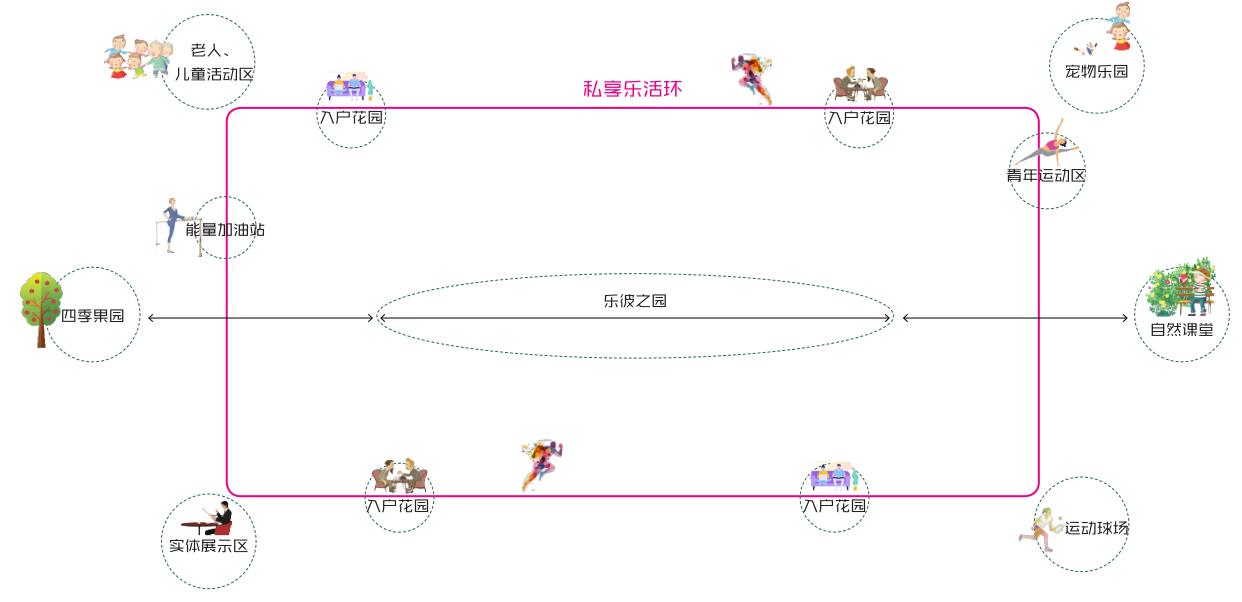为让栖居者有更惬意舒适的宅间活动空间,项目环区设计一条约700米的环形跑道(私享乐活环)串联了四大功能模块,分别为景观会客功能模块、老幼活动功能模块、健康功能模块、宠物活动模块。